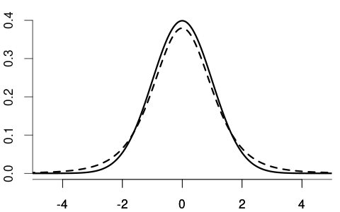 Below you find a plot of the PDFs of N(0,1) together with the t_5-distribution, which is the t-distribution with 5 degrees of freedom: