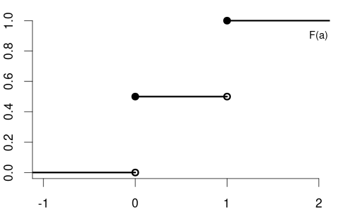 The CDF of the variable coin is F(a) = \begin{cases} 0 & a < 0, \\ 0.5 & 0 \leq a < 1, \\ 1 & a \geq 1, \end{cases} with the following CDF plot: