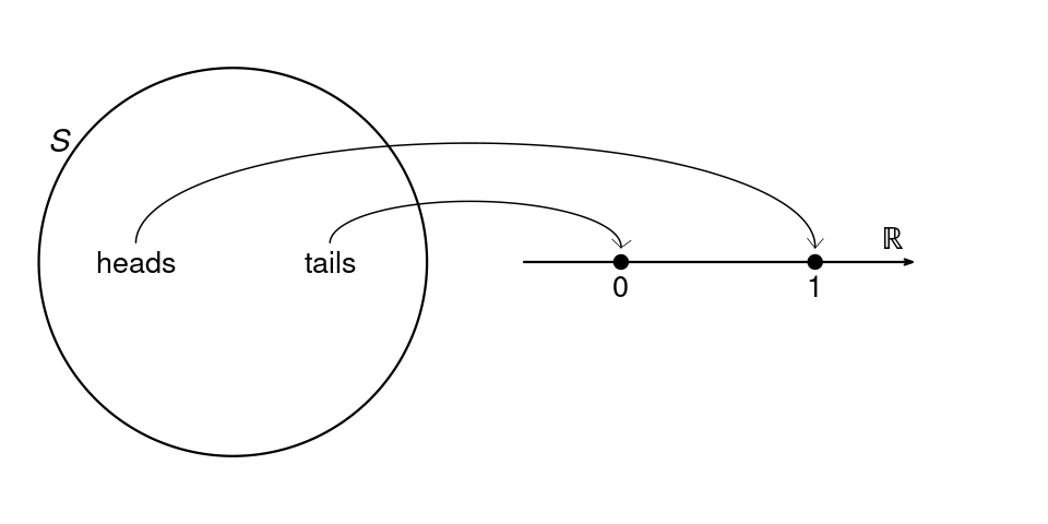 Coin toss: The outcome of a coin toss can be ‘heads’ or ‘tails’. This random experiment has a two-element sample space: S = \{heads, tails\}.