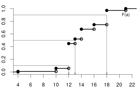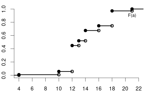 Some CDFs have jumps/steps, and some CDFs are smooth/continuous. If F has a jump at domain point a, then the PMF at a is \pi(a) = P(Y=a) = F(a) - \lim_{\epsilon \to 0} F(a-\epsilon) = \text{``jump height at} \ a\text{''.} \tag{2.1} If F is continuous at domain point a, we have \lim_{\epsilon \to 0} F(a-\epsilon) = F(a), which implies that \pi(a) = P(Y=a) = 0.