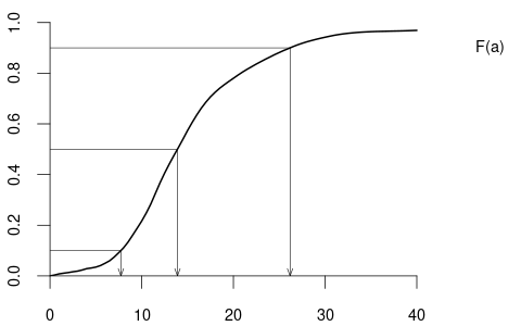 From the quantile plot, we find that q(0.1) = 7.73, q(0.5) = 13.90, q(0.9) = 26.18. Under this wage distribution, the median wage is 13.90 EUR, the poorest 10% have a wage of less than 7.33 EUR, and the richest 10% have a wage of more than 26.18 EUR.