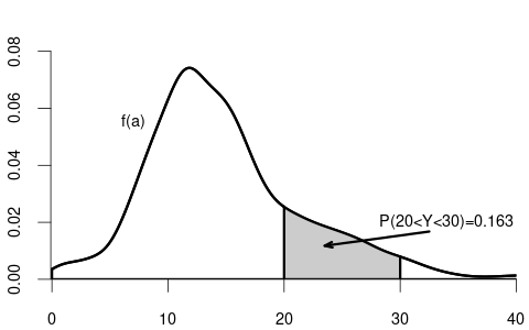 The probability density function (PDF) or simply density function of a continuous random variable Y is a function f(a) that satisfies F(a) = \int_{-\infty}^a f(u) \ \text{d}u The density f(a) is the derivative of the CDF F(a) if it is differentiable: f(a) = \frac{d}{da} F(a).