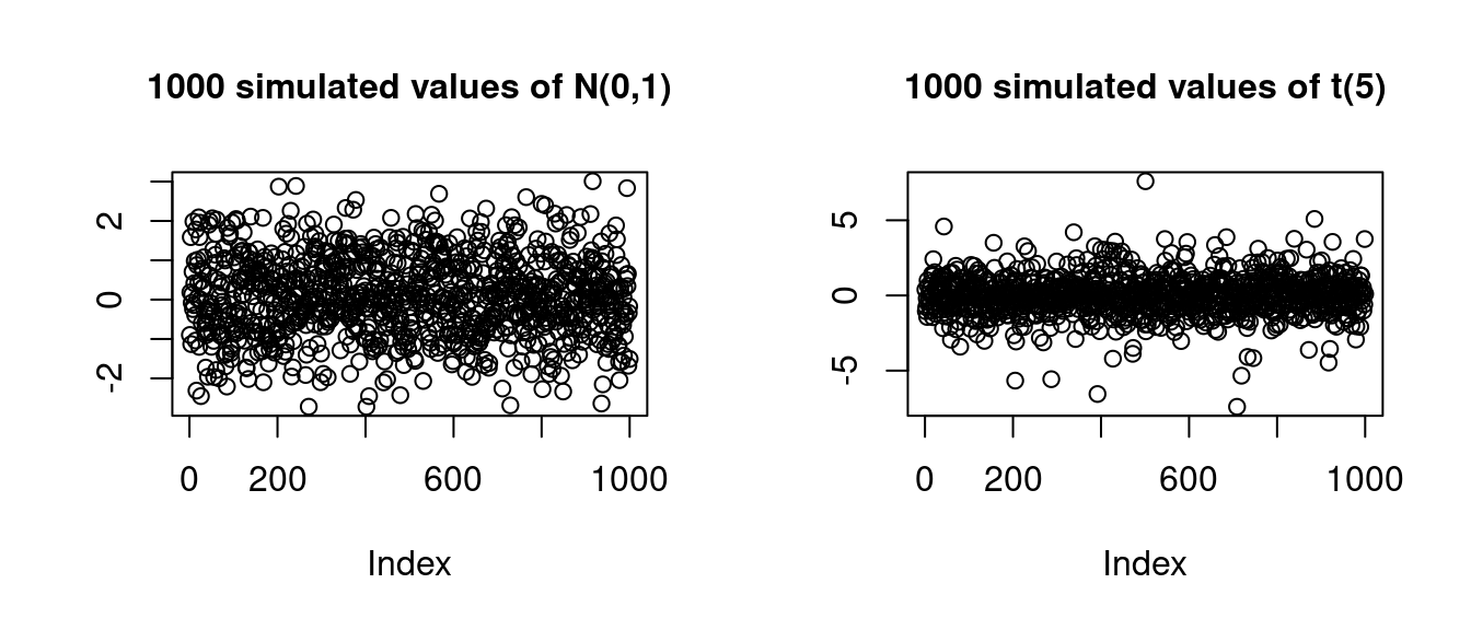 plot(rt(1000,5), main = "1000 simulated values of t(5)", ylab = "")