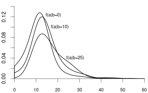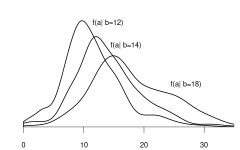 Consider the density f_{YZ}(a,b) of two continuous random variables Y and Z. The conditional density of Y given Z=b is f_{Y|Z}(a \mid b) = \frac{f_{YZ}(a,b)}{f_Z(b)}. The conditional distribution of Y given Z=b is F_{Y|Z}(a \mid b) = \int_0^a f_{Y|Z}(u \mid b) \ \text{d}u.