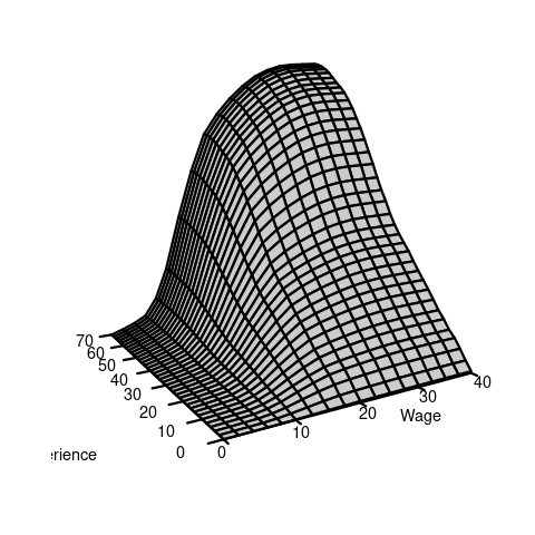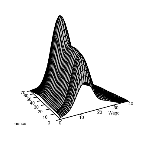 \begin{align*} E[wage \mid experience] &= m(experience) \\ &= 14.5 + 0.9 experience - 0.017 experience^2 \end{align*}