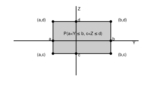 Calculation of probabilities using a bivariate distribution function: \begin{align*} P(Y \leq a, Z \leq b) &= F_{YZ}(a,b) \\ P(a < Y \leq b, c < Z \leq d) &= F_{YZ}(b,d) - F_{YZ}(b,c) - F_{YZ}(a,d) + F_{YZ}(a,c) \end{align*}