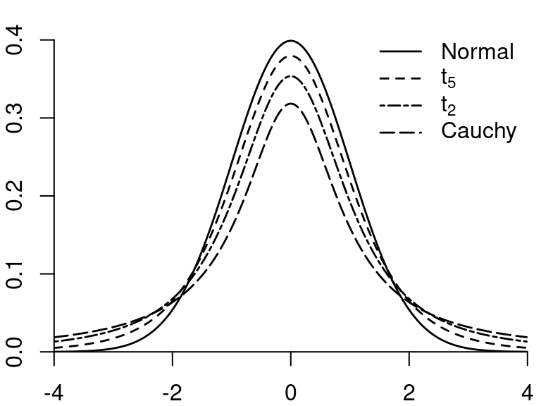 The t-distribution with m=1 is also called Cauchy distribution. The t-distributions with 1, 2, 3, and 4 degrees of freedom are heavy-tailed distributions. If m \to \infty then t_m \to \mathcal N(0,1)