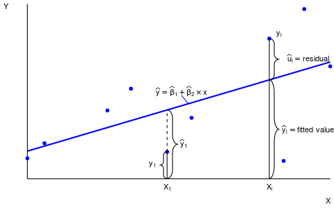 The fitted values or predicted values are \widehat Y_i = \widehat \beta_1 + \widehat \beta_2 X_{i2} + \ldots + \widehat \beta_k X_{ik} = X_i'\widehat \beta, \quad i=1, \ldots, n. The residuals are \widehat u_i = Y_i - \widehat Y_i = Y_i - X_i'\widehat \beta, \quad i=1, \ldots, n.