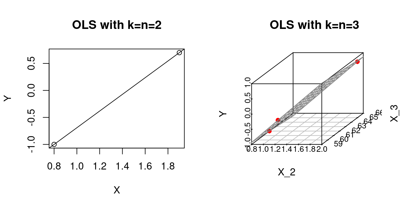 If the number of regressors and observations k=n are higher, we can no longer visualize the OLS fit, but the problem still exists: we have Y_i=\widehat Y_i for all i=1, \ldots n.